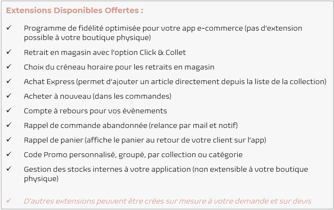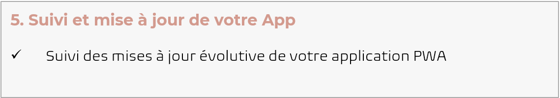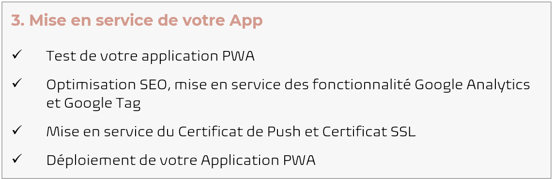La Web App c'est le meilleur du site internet et de l'application mobile... En bref, c'est LA SUPER BOUTIQUE ! Elle te permet d'être accessible partout, et téléchargeable sur tous les supports : ordinateurs, tablettes ou téléphones. Simple et intuitive elle te permet de gagner du Temps dans la gestion de tes ventes et des suivis clients. Grâce à ses fonctions optimisées, tu gagnes aussi en Visibilité ce qui t'amène plus de clients et plus de ventes. Contenu de votre Offre Web App Sérénité : ✅ Création ou Adaptation de votre Logo & Icon ✅ Réalisation du Design de votre application e-Commerce ✅ Installation et mise en service des extensions sélectionnées ✅ Mise en ligne de votre application Progressive Web App ⚠️ Conditions d’abonnement : Vous payez aujourd'hui les frais de création, vérification et déploiement pour votre Web App, puis votre abonnement mensuel au prix de 65€ par mois sans engagement et à tacite reconduction à partir de la mise en service. Votre application sera mise en service dans un délai approximatif de 10 à 30 jours.