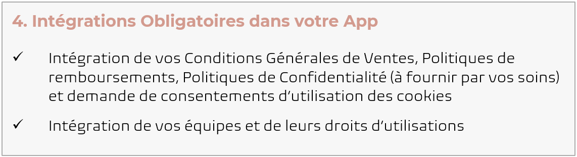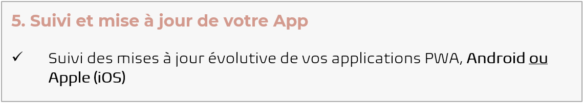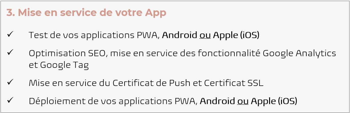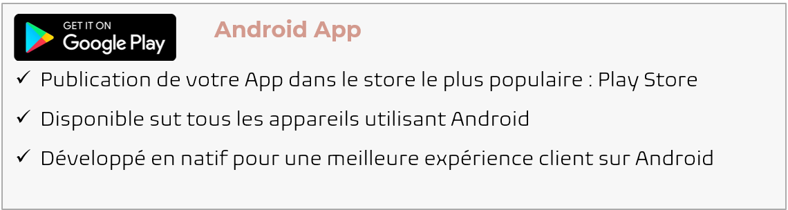 Contenu de l'Offre Web App & Android ou iOS : ✅ Création ou Adaptation de ton Logo & Icon ✅ Réalisation du Design de ton application e-Commerce ✅ Installation et mise en service des extensions sélectionnées ✅ Mise en ligne de ton application Web App ✅ Déploiement de ton App Native Android (hors frais de compte développer 25€ une fois) ou ✅ Déploiement de ton App Native iOS (hors frais de compte développer 99€/an) ⚠️ Conditions d’abonnement : Tu payes aujourd'hui les frais de création, vérification et déploiement pour ton Web App et de votre Android ou iOS App, puis ton abonnement mensuel au prix de 65€ par mois sans engagement et à tacite reconduction à partir de la mise en service. Ta Web App sera mise en service dans un délai approximatif de 20 à 30 jours et votre Android ou Apple App sous quelques semaines (ces délais étant soumis aux service de Google ou Apple)